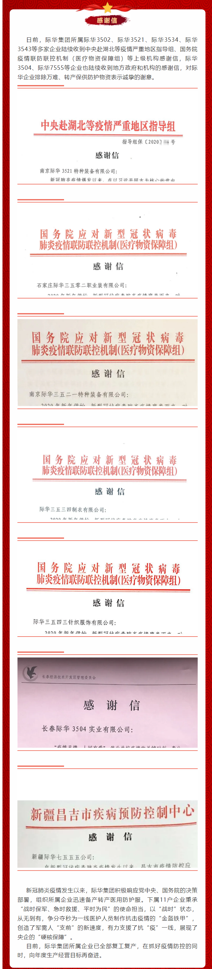 际华所属多家企业收到感谢信