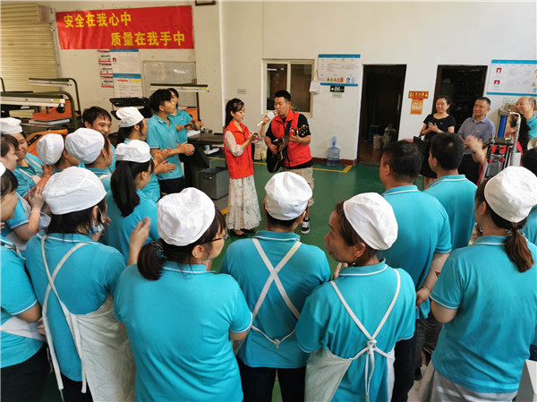 边家村工人文化宫组成了文艺小分队,在生产车间为职工献上《找自己》《你好吗》和《军营飞来一只百灵鸟》等动听歌曲,精彩的演出赢得了大家的阵阵掌声。当天傍晚,文艺队在公司家属区免费放映电影《湄公河行动》,让一三职工充分感受到来自上级以及公司工会的诚挚关怀。