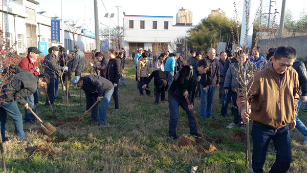 在布机车间空地东侧和西侧,大家踩着柔软的湿地,挥动铁锹,铲土填坑,植出了一株株新苗,大家顾不上鞋上的泥土和身上的汗水,齐心协力,鼓足干劲,挖坑培土,一阵忙碌之后,160余棵红玉兰、红叶碧桃等观赏树木,载在了三月的和煦春风里,绿化了厂区满目春色。